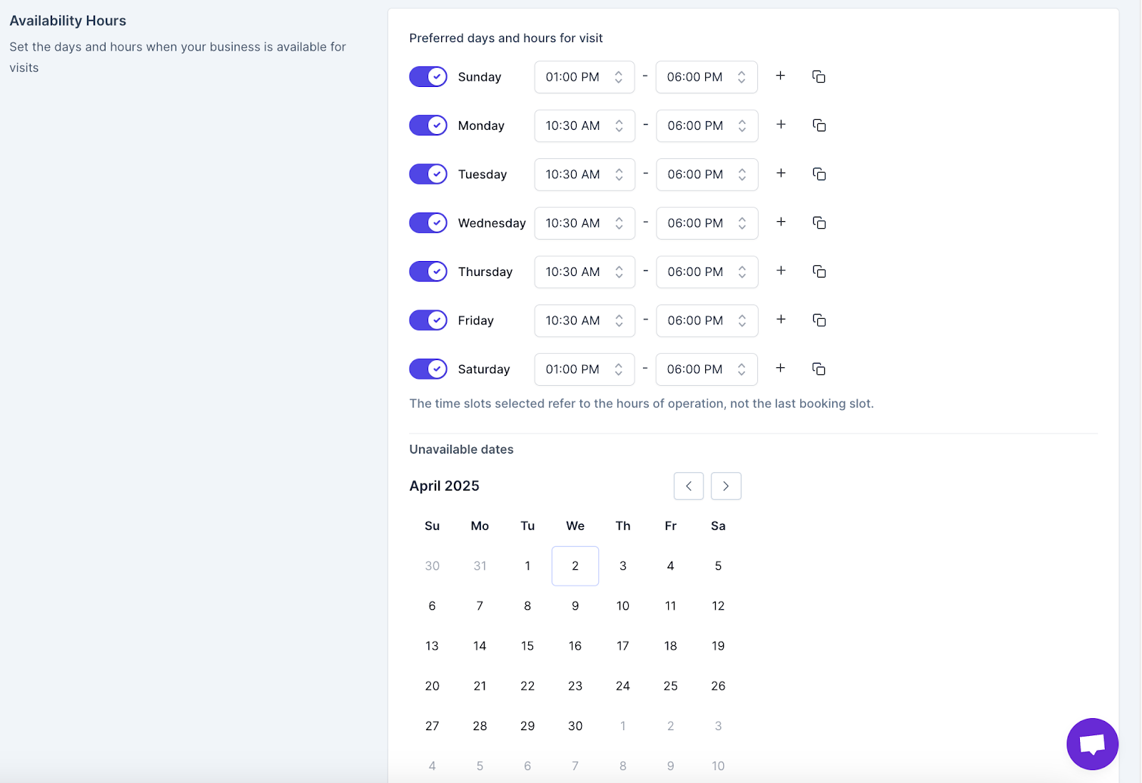Later on, in the "Campaigns" page, you can edit your schedule further. Please remember that the dates that show here depend on the availability hours you set earlier for your business on the "Locations" tab. Here's a quick look at each:
