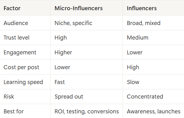 Choose micro-influencers when you care about ROI (actual revenue, not vanity metrics), learning speed, risk control, and consistency you can replicate. Choose influencers when you care about reach (just putting eyes on something), visibility at scale, brand perception, and top-of-funnel awareness.